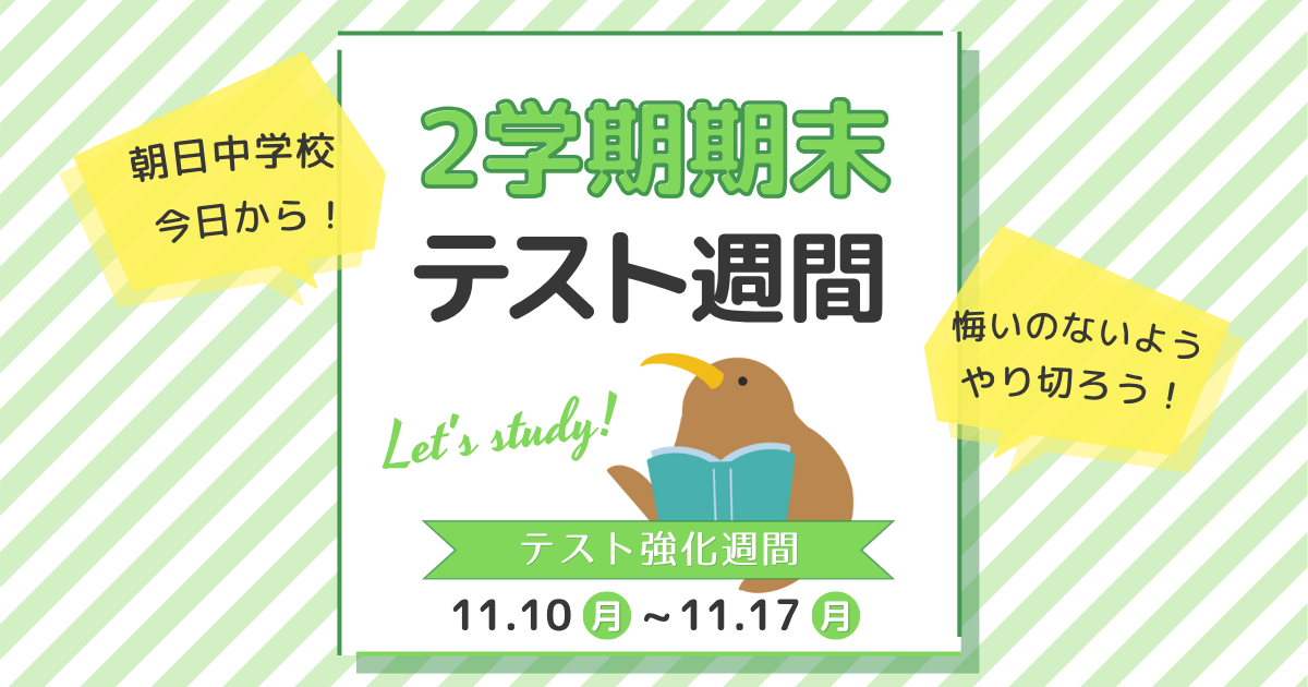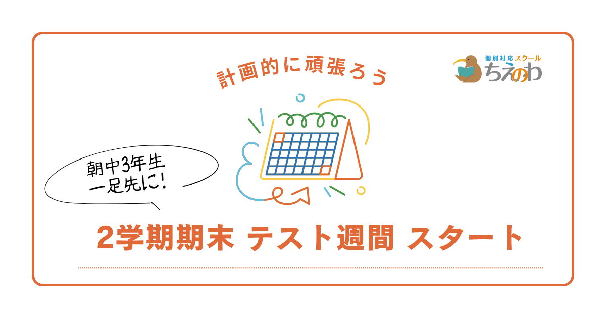 みなさん こんにちは! 東刈谷小学校から徒歩1分「スクールちえのわ」 副室長の岡田です。 本日から、朝日中学校3年生が 2学期期末テスト週間 に入りました! テストは11月14日(金)・17日(月)・18日(火)の3日間 …