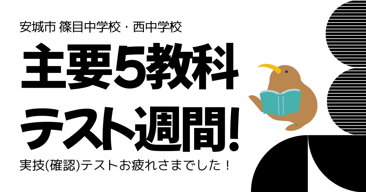 みなさん こんにちは! 東刈谷小学校から徒歩1分「スクールちえのわ」 副室長の岡田です。 今日は、安城市の篠目中学校・西中学校で 確認テスト(実技教科)が行われました。 まずは皆さん、本当にお疲れさまでした! テスト勉強 …