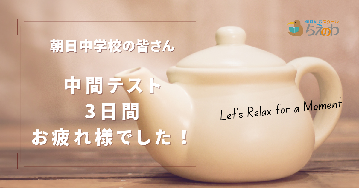 みなさん こんにちは! 東刈谷小学校から徒歩1分「スクールちえのわ」 副室長の岡田です。 朝日中学校の皆さん、中間テストお疲れさまです! 1・2年生はテスト2日目、 そして3年生は今日が初日でしたね。 教室に来た皆さんの …